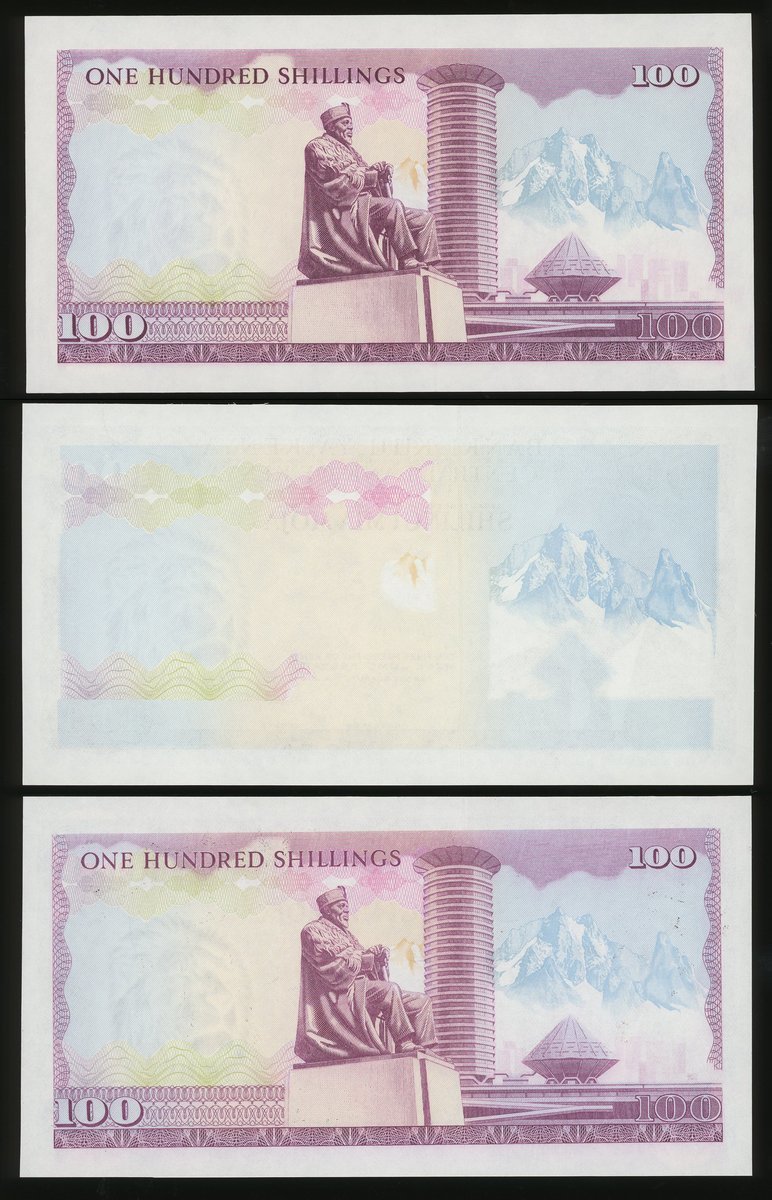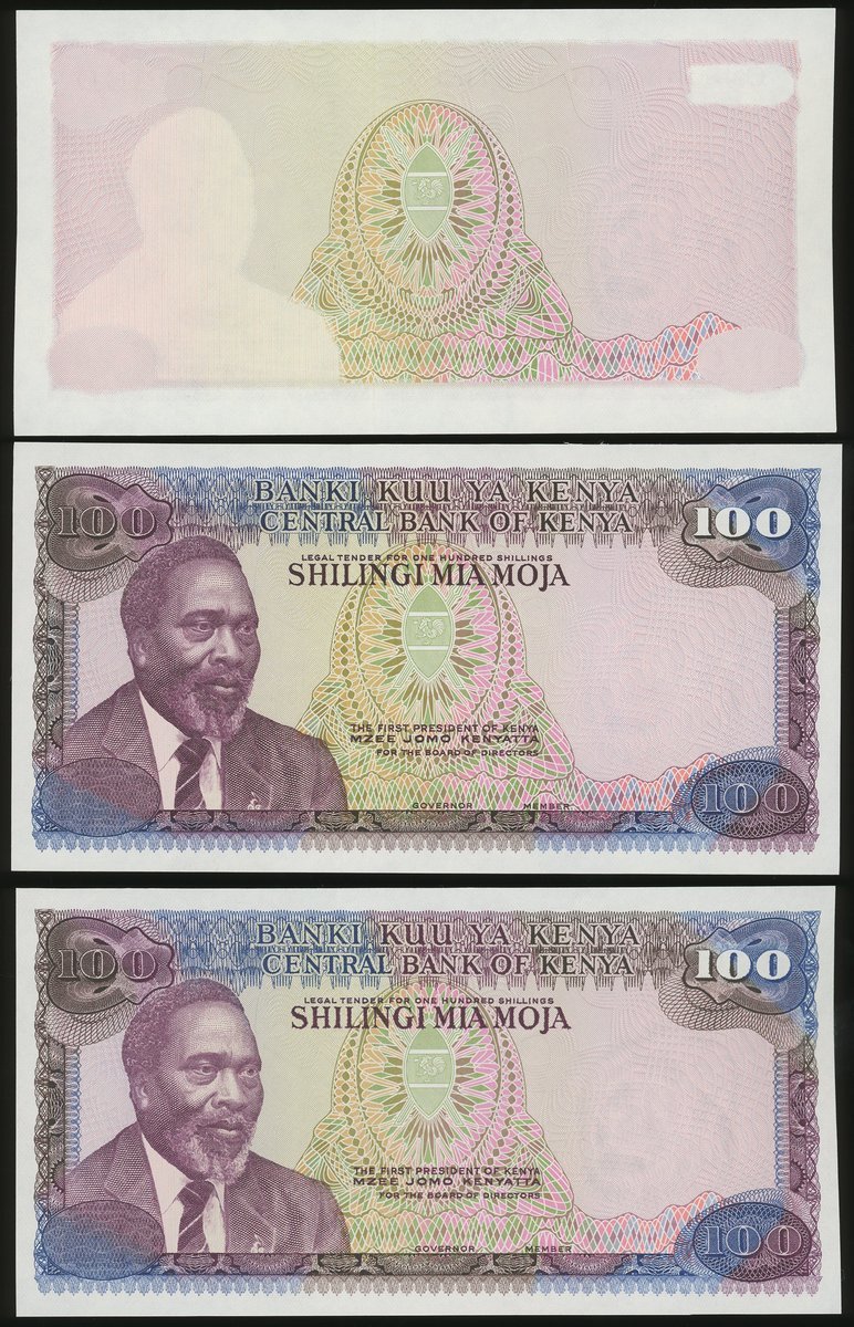 (x) Central Bank of Kenya, progressive proofs for 100 shillings (3), ND (1978), first obverse with underprint only, reverse fully printed, second obverse fully printed, reverse with underprint only, third note missing serial numbers, signatures and date,