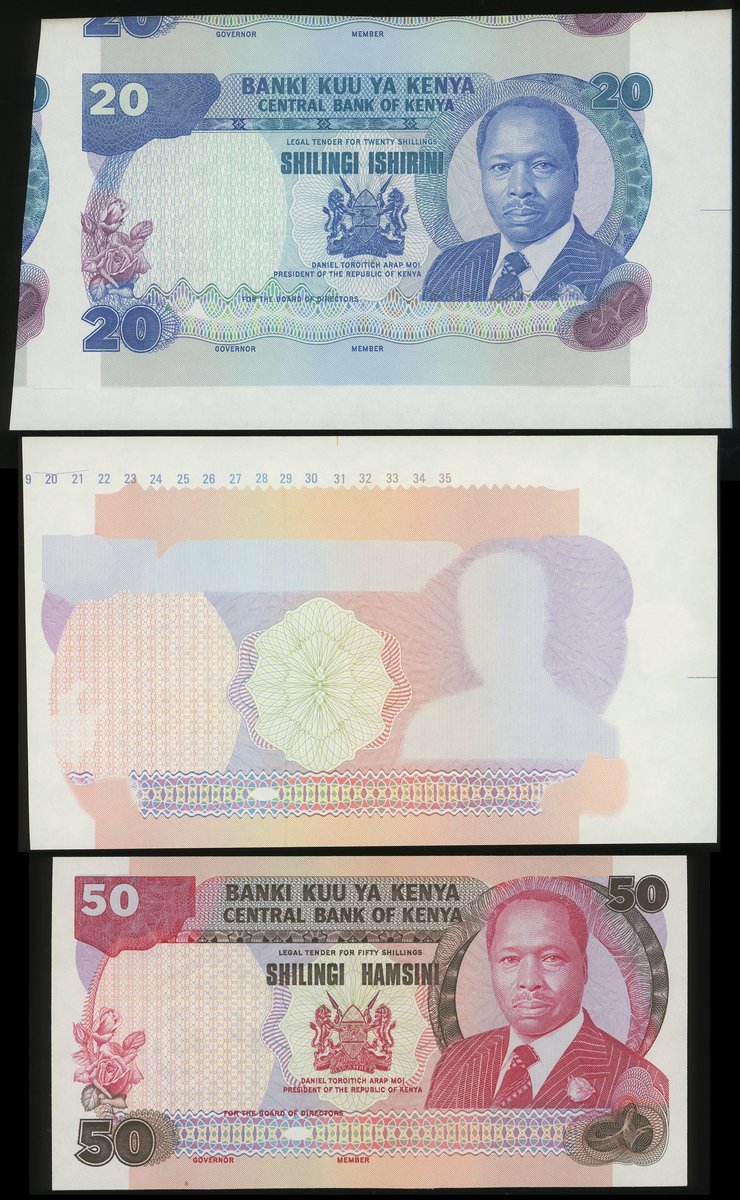 (x) Central Bank of Kenya, progressive proofs for 50 shillings (2), ND (1980-88), first example with obverse underprint, printing guides at top margin, second example fully printed without serial numbers and signatures, also a progressive proof for 20 shillings, ND (1980-88),