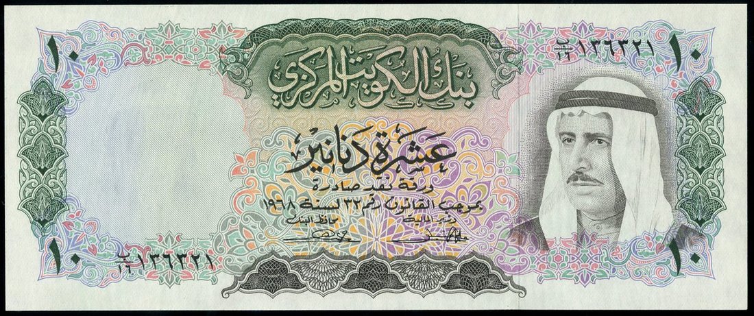 Central Bank of Kuwait, 10 Dinars, 1968, serial number 136321, green on multicolour, Amir Shaikh Abdullah at right and also as watermark, western numerals on reverse with bank title and dhow at centre