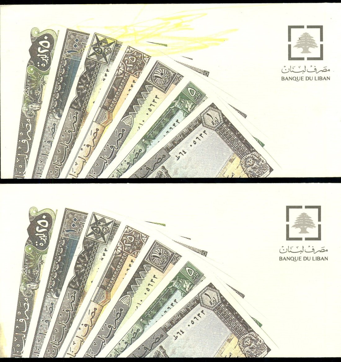 (x) Banque du Liban, 250 (2), 100 (2), 50 (2), 25 (2), 10 (2), 5 (2), 1 (2) livre, (1980-85), (67c, 66c, 65c, 64c, 63f, 62d, 61c, TBB B509c, B508b, B507b, B506, B504f, B503i, B502h, B501g) few good extremely fine, remainder about uncirculated to uncirculated, including 2 Banque de Liban envelopes (14 banknotes)