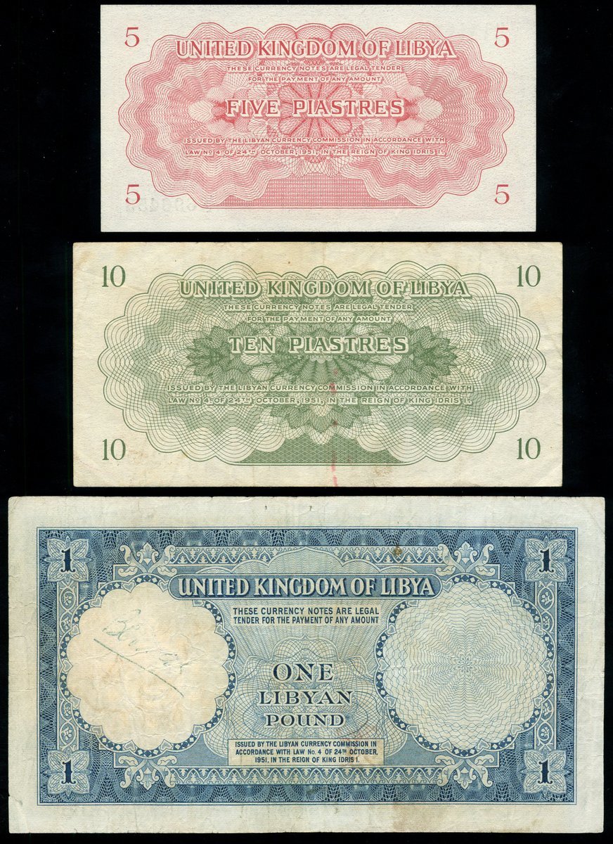United Kingdom of Libya, 5, 10, piastres, 1 pound, 1951, (Pick 5, 6, 9, TBB B201, B202, B205), 5 piastres about unc, 10 piastres very fine, 1 pound fine (3)