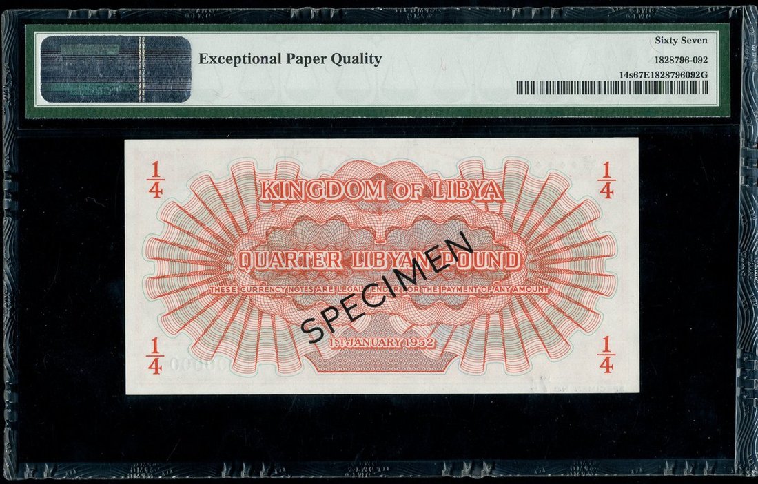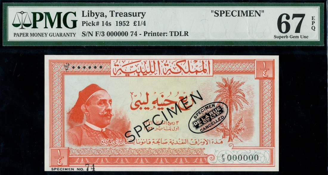Kingdom of Libya, specimen £1/4, 1952, serial number F/3 000000 74, (Pick 14s, TBB B103as2), black oval DLR SPECIMEN and diagonal SPECIMEN overprint, in PMG holder 67EPQ Superb Gem Uncirculated, very high grade