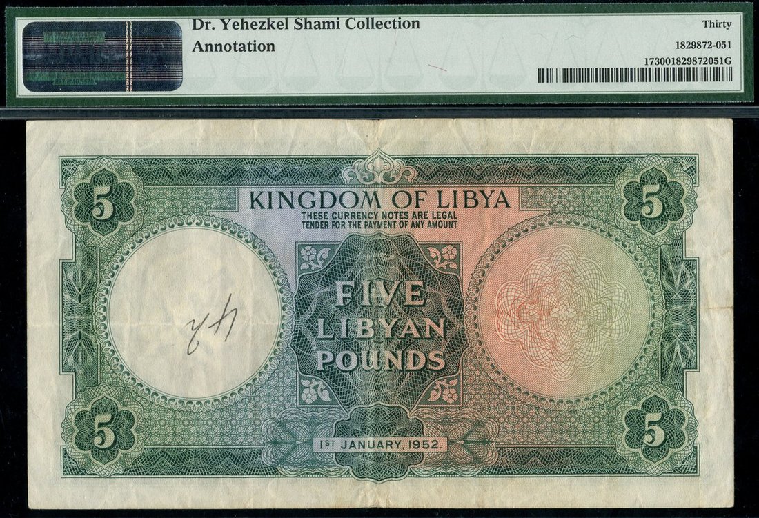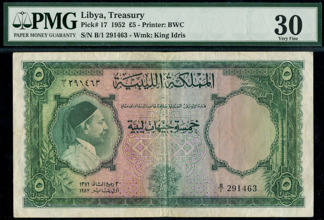(x) Kingdom of Libya, 5 pounds, 1952, serial number B/1 291463, green, pale lilac and pink, King Idris at left, bush low centre