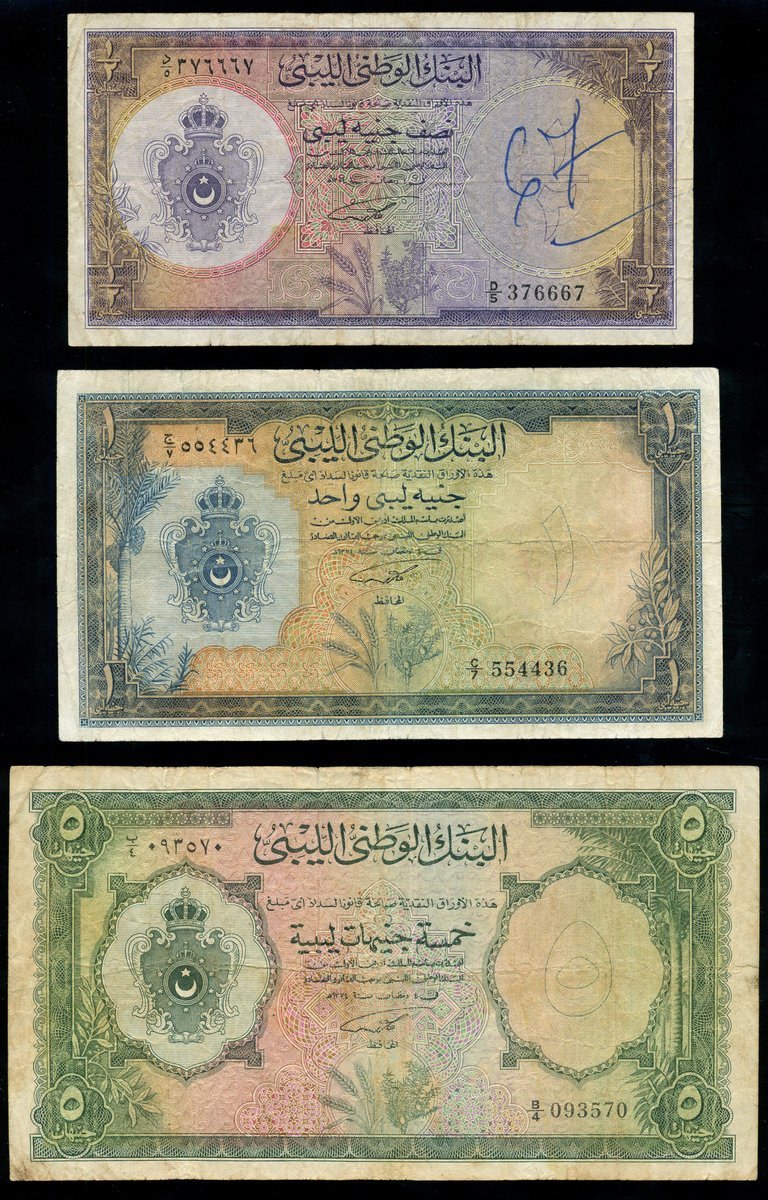 National Bank of Libya, 5, 1, 1/2 Libyan pounds, ND 1955, green, blue and purple respectively, coat of arms at left