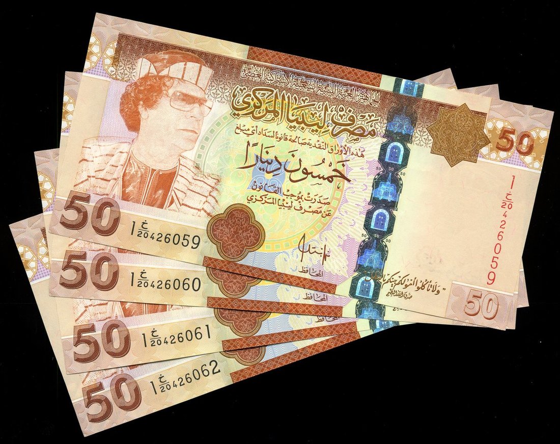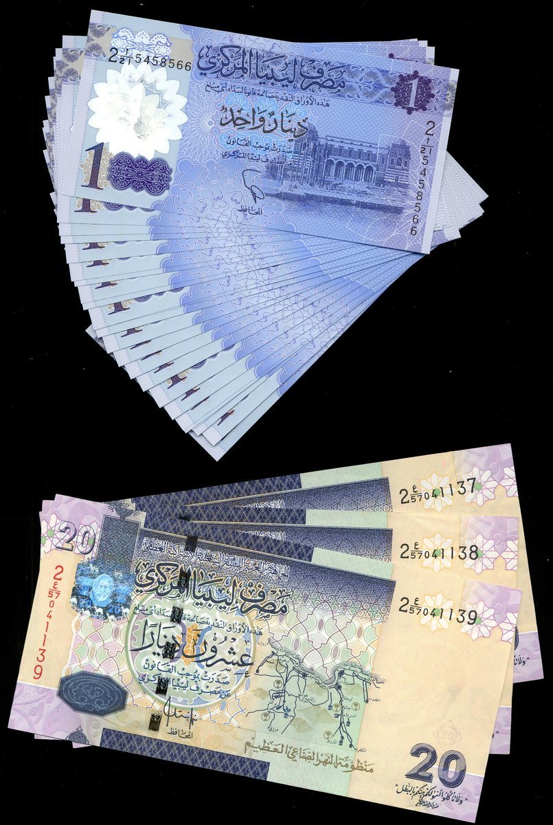 Central Bank of Libya, 50 (4), 20 (3), 1 (24) dinar(s), ND (2008-19), (Pick 75a, 74a, TBB B539a, 538a), 50 and 20 slight handling on corners, otherwise crisp about uncirculated to uncirculated,