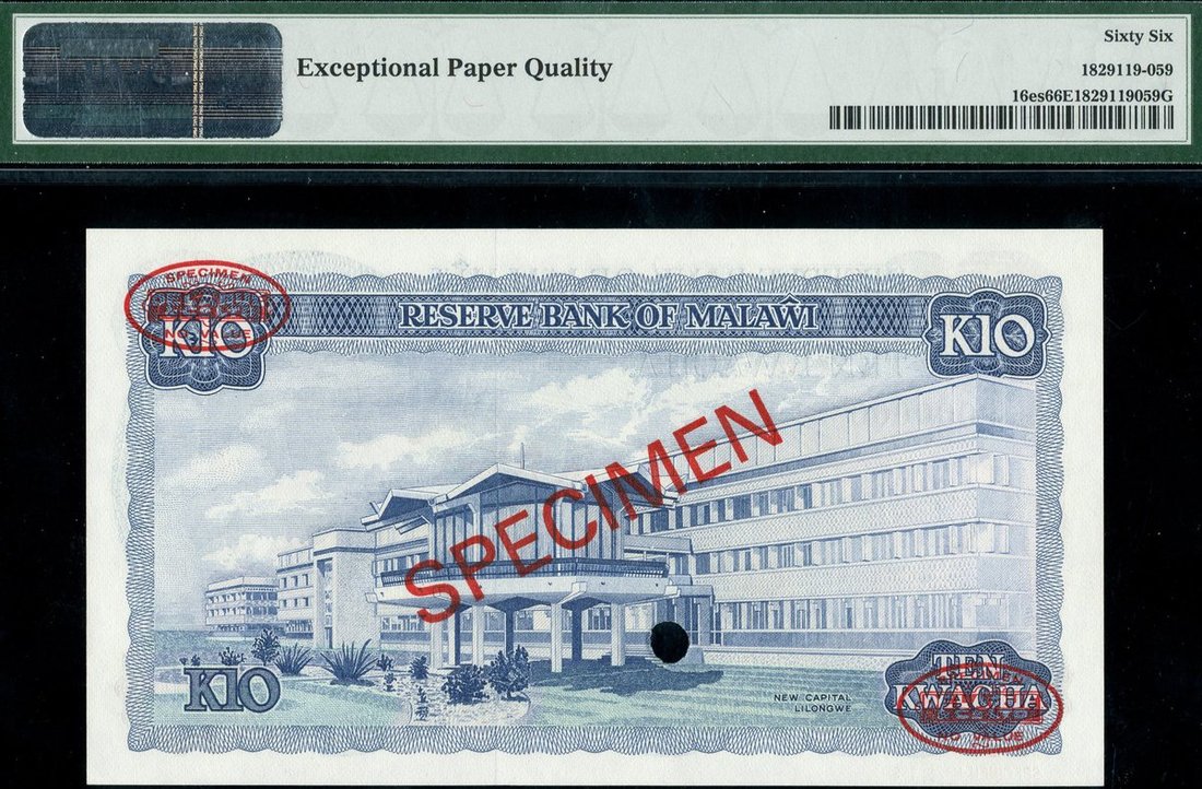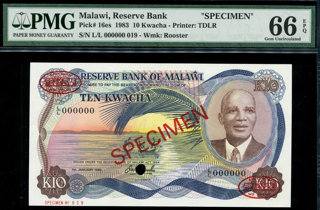 Reserve Bank of Malawi, specimen 10 kwacha, 1st January 1983, serial number L/L 000000 019, (Pick 16es, TBB B116s), red oval DLR SPECIMEN and diagonal SPECIMEN overprint, cancelation punch hole, in PMG holder 66EPQ Gem Uncirculated