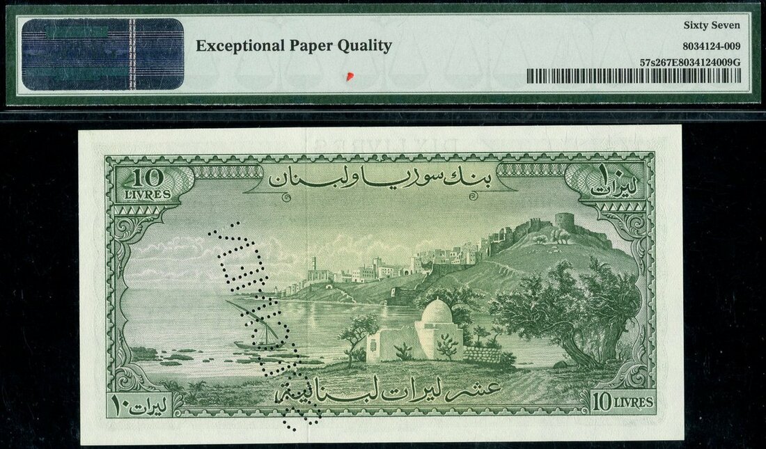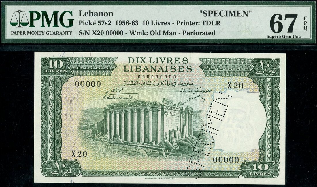 (x) Banque de Syrie et du Liban, Lebanon, specimen 10 livres, 1956, serial number X20-00000, dark and light green and pale pink, ruins of the Temple of Bacchus at right, diagonal perforated SPECIMEN at right, reverse, green, shoreline and hillside city scene,