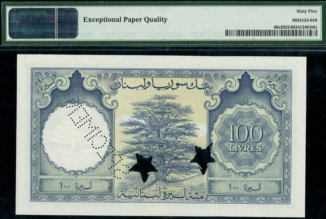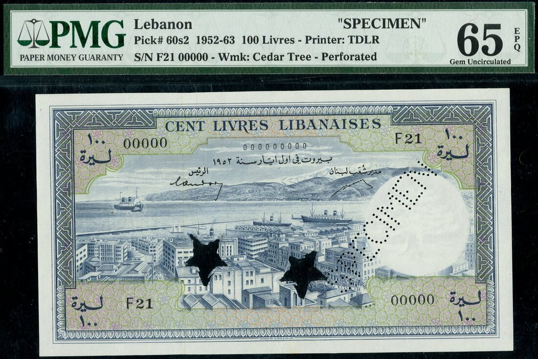 (x) Banque de Syrie et du Liban, Lebanon, specimen 100 livres, 1952, serial number F21 00000, blue and lilac, Beirut harbour at centre, reverse blue, Cedar tree at centre, value at right