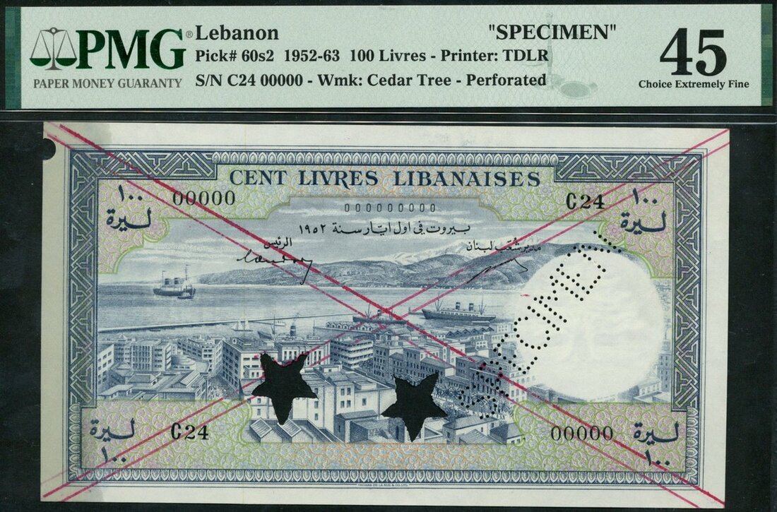 Banque de Syrie et du Liban, Lebanon, specimen 100 livres, 1952, serial number prefix C24, blue and lilac, Beirut harbour at centre, reverse blue, Cedar tree at centre, value at right