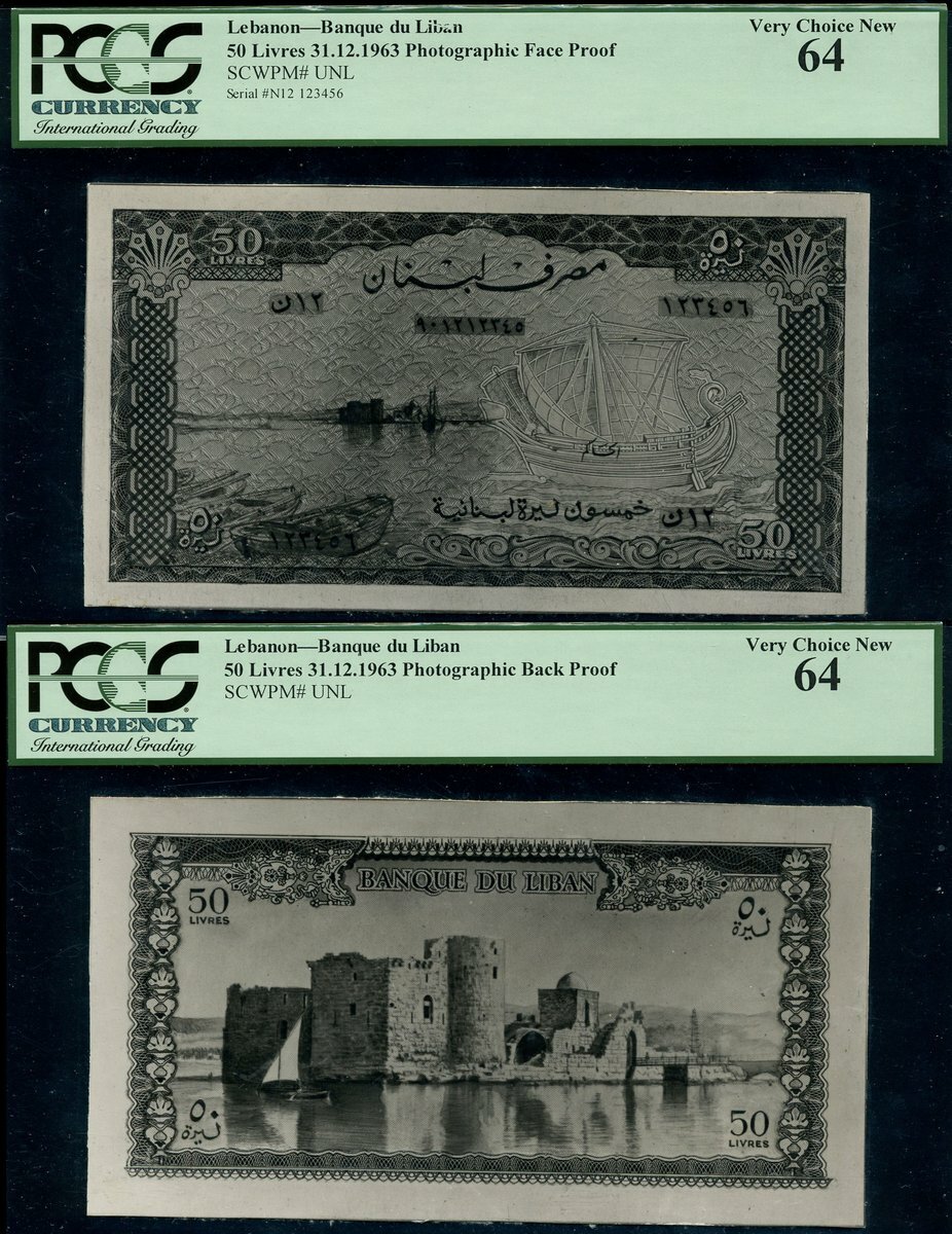 (x) Banque du Liban, Lebanon, obverse and reverse archival photographs for an unissued 50 livres, 31 December 1963, serial number 123456, black and white, port at left, Phoenician merchant ship at right, reverse, Citadel at Sea and port at the port of Saida,