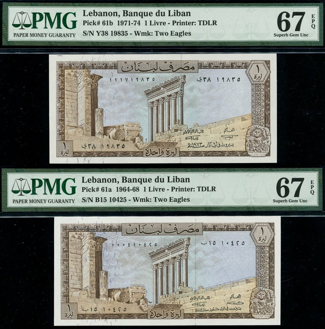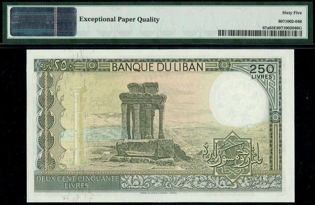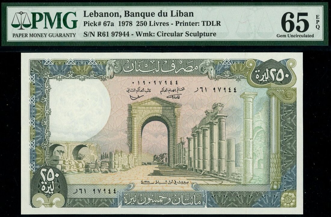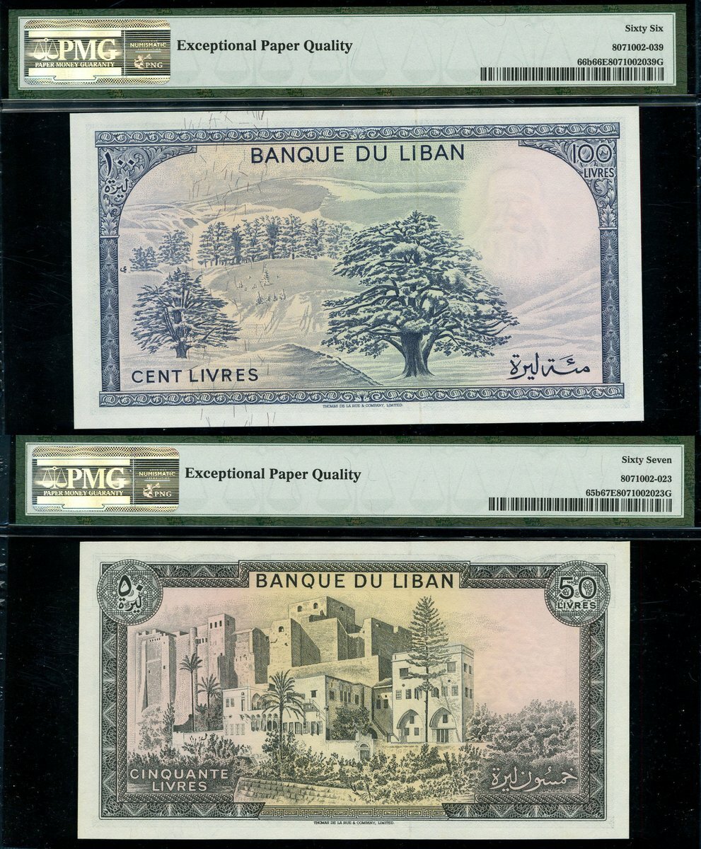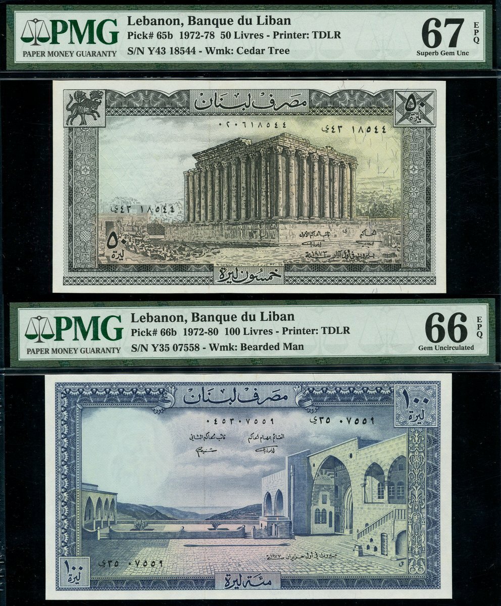 (x) Banque du Liban, 1 livre (2), 1964, 1973, pink-brown and pale blue, 50 livres, 1973, dark grey and pale blue, 100 livres, 1977, blue and 250 livres, 1978