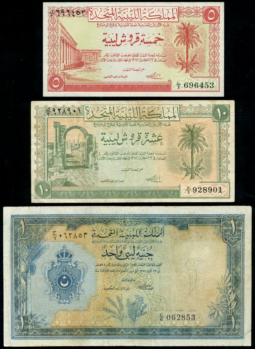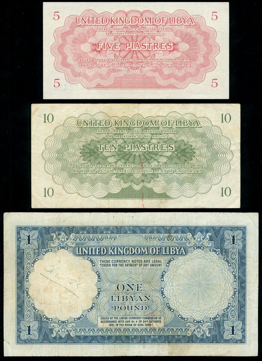 United Kingdom of Libya, 5, 10, piastres, 1 pound, 1951, (Pick 5, 6, 9, TBB B201, B202, B205), 5 piastres about unc, 10 piastres very fine, 1 pound fine (3 notes)