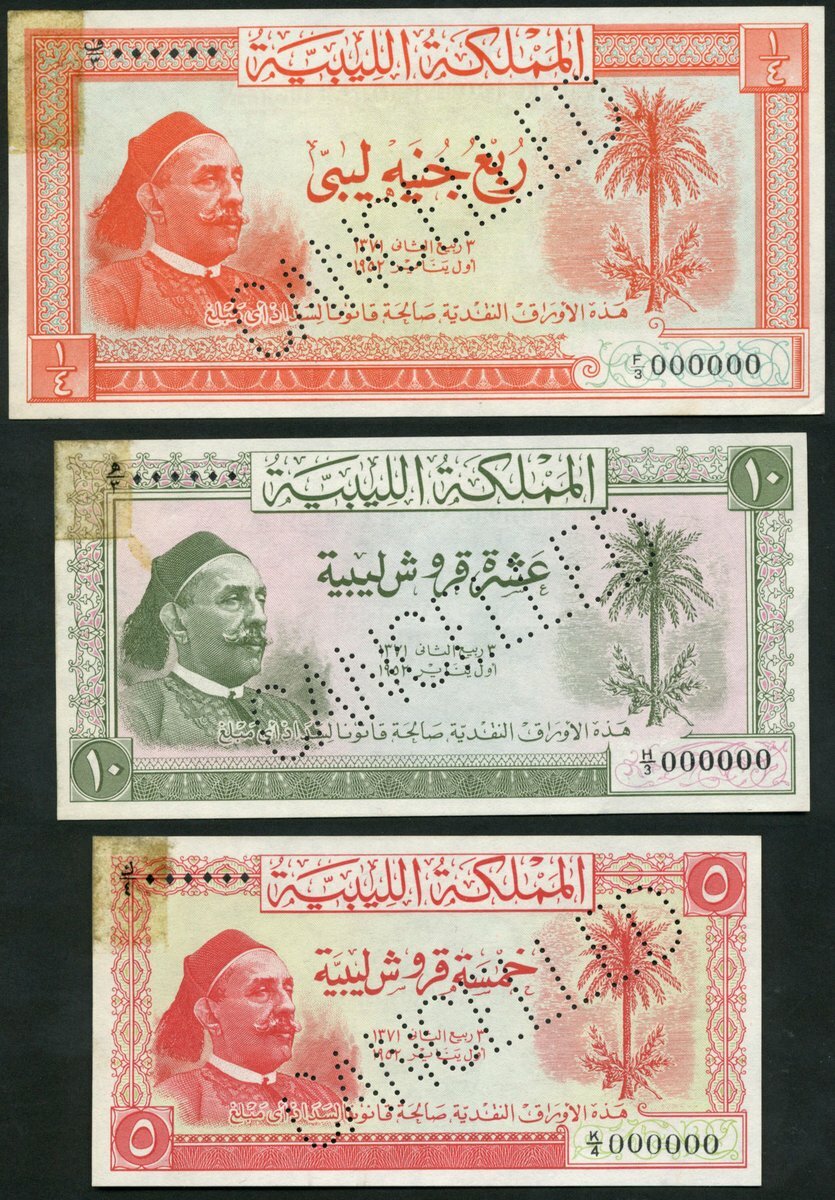 Kingdom of Libya, specimen 5 piastres, 1952, serial number K/4 000000, red and pale green, King Idris at left, arms at right, also specimen 10 piastres, 1952, serial number H/3 000000, green and pink, design as previous, and 1/4 Libyan pound, 1952, serial number K/4 000000,