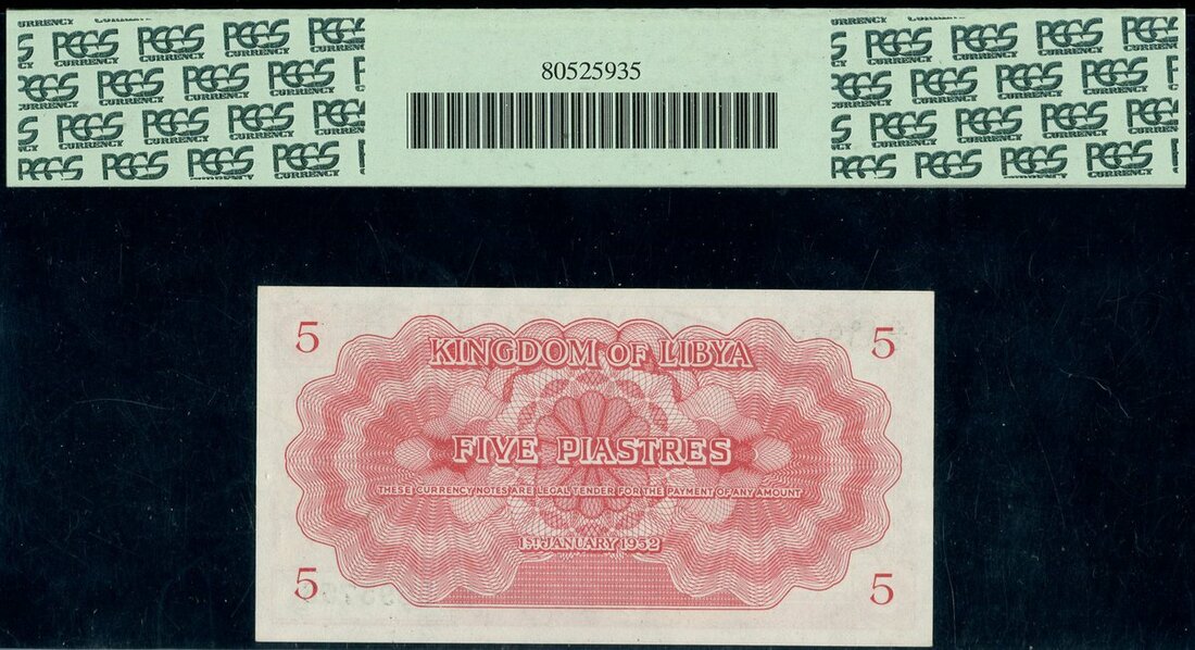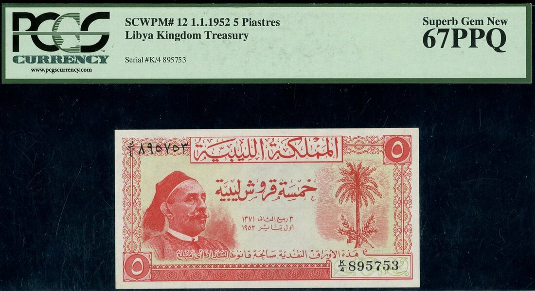 (x) Kingdom of Libya, 5 piastres, 1 January 1952, serial number K/4 895753, red and pale green, King Idris at left, palm tree at right