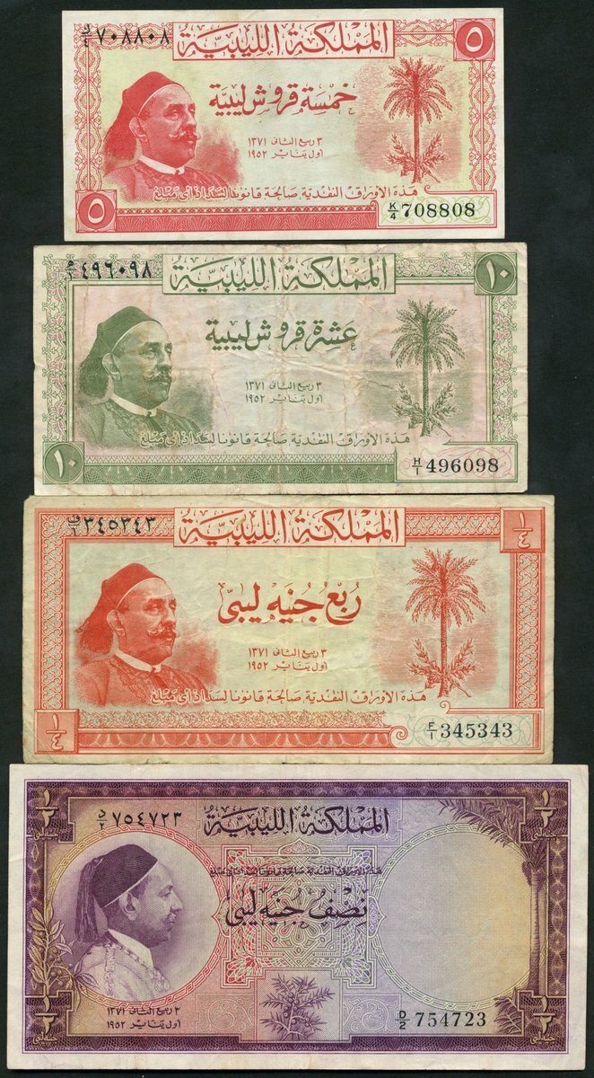 Kingdom of Libya, 5, 10 piastres, 1/4 and 1/2 pound, ND (1952), (Pick 12, 13, 14, 15), very fine (4 notes)
