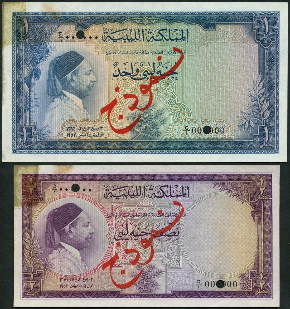 Kingdom of Libya, specimen 1/2, 1 Libyan pound, 1952, prefix D/1, C/1, 1/2 pound, purple 1 pound, blue, both with King Idris at left,