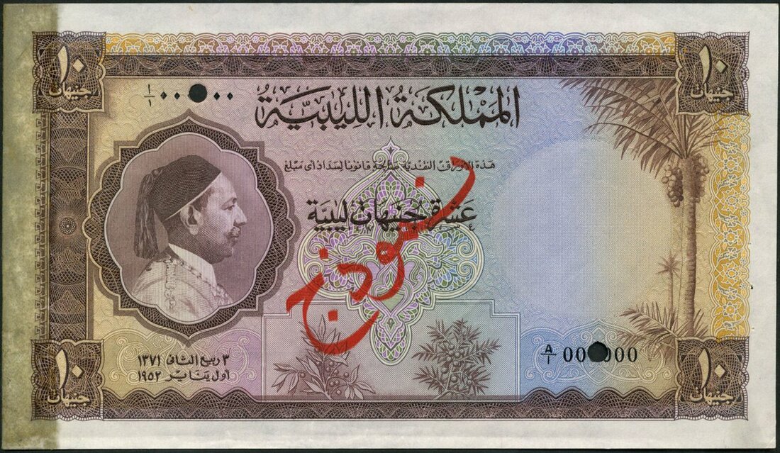 Kingdom of Libya, specimen 10 pounds, 1952, serial number A/1 000000, brown and multicoloured, King Idris wearing fez at left, bush low left, palm tree at right, reverse brown