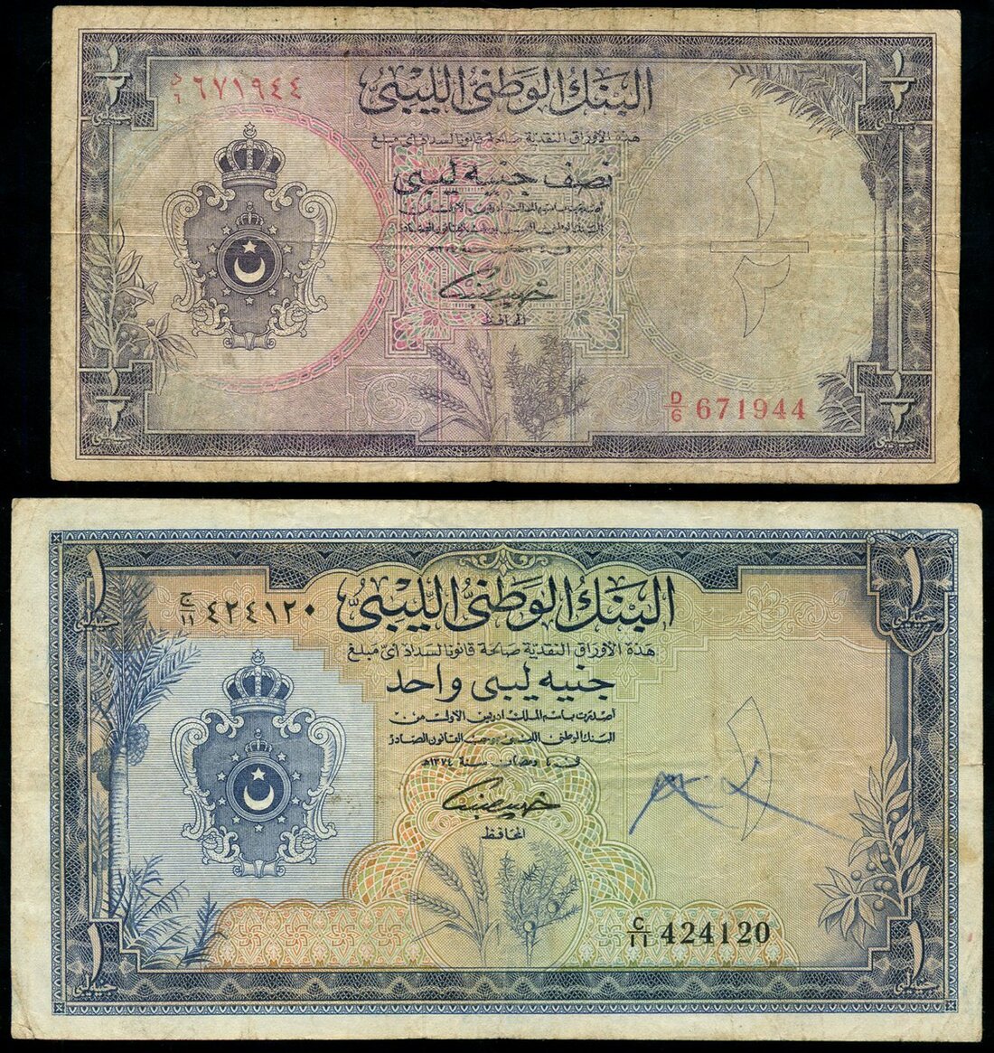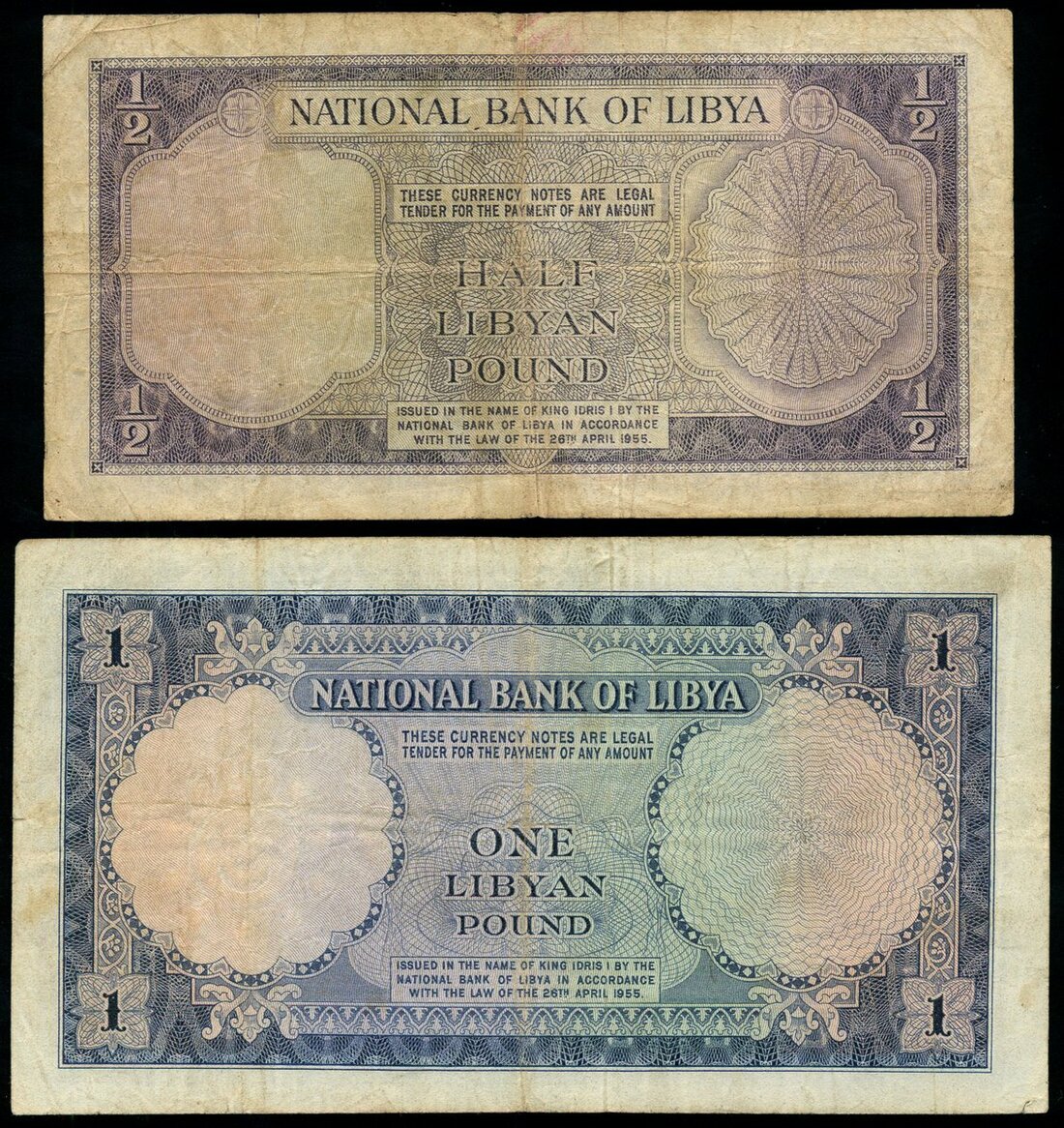 National Bank of Libya, 1/2, 1 Libyan pound, 1955, (Pick 19b, 20, TBB B301b, B302b), fine (2 notes)