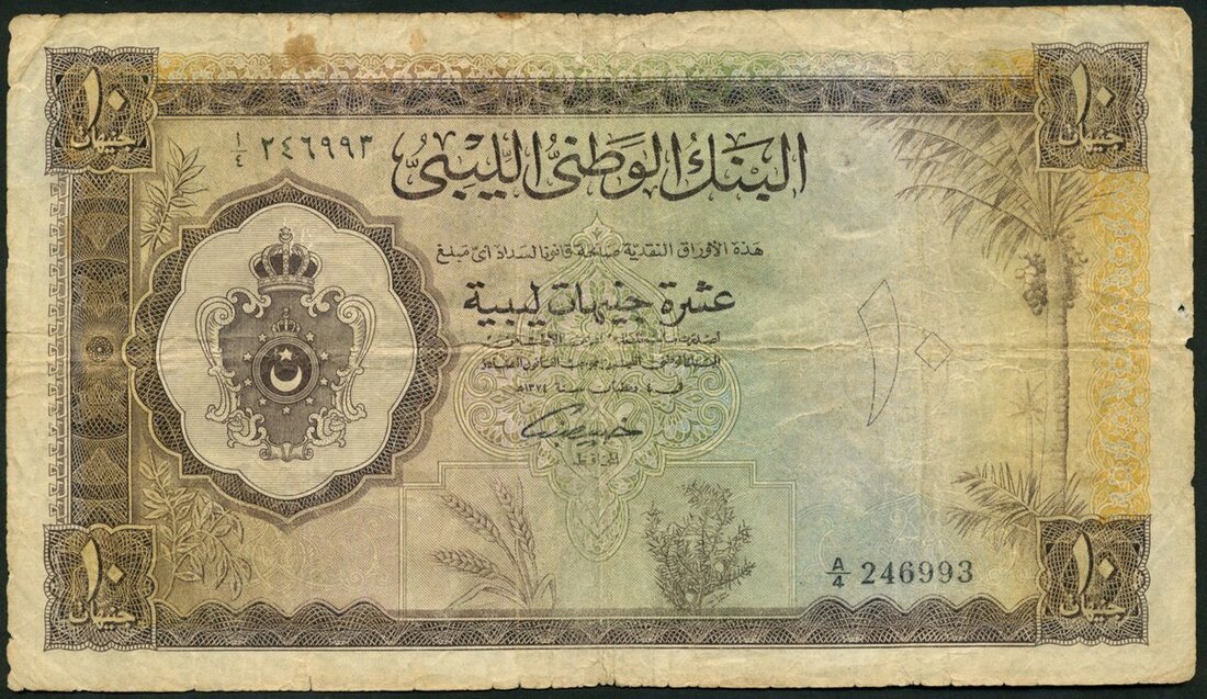National Bank of Libya, 10 pounds, 1955, serial number 246993, (Pick 22, TBB B304), about fine