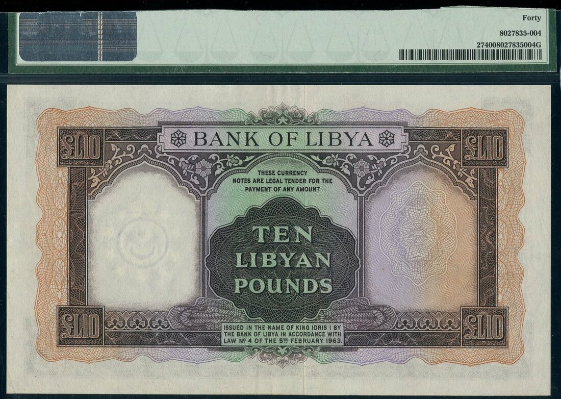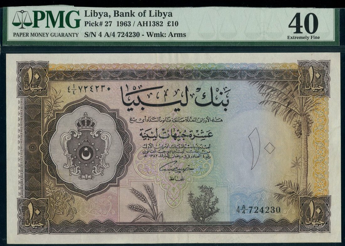 (x) Bank of Libya, £10, 1963, serial number 4A/4 724230, brown on multicolour underprint, arms at left, value in each corner and at right, reverse, guilloche patterns
