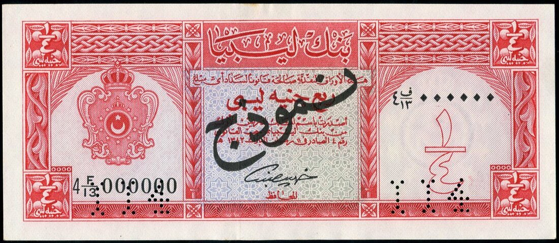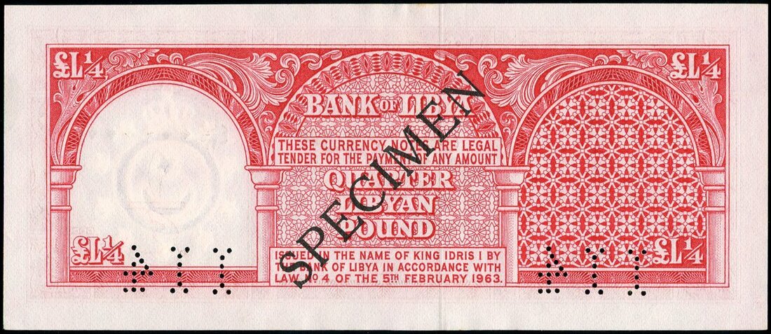 Bank of Libya, specimen 1/4, Libyan pound, 1963, (Pick 28s, TBB B406s), minor stain at upper margin, otherwise about uncirculated
