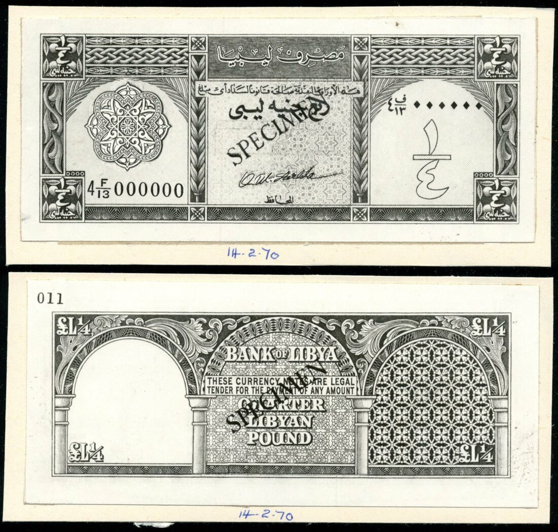 Bank of Libya, a pair of obverse and reverse printer's archival photographs for an unadopted design of 1/4 pound, 1970, decorative patterns and boarders,