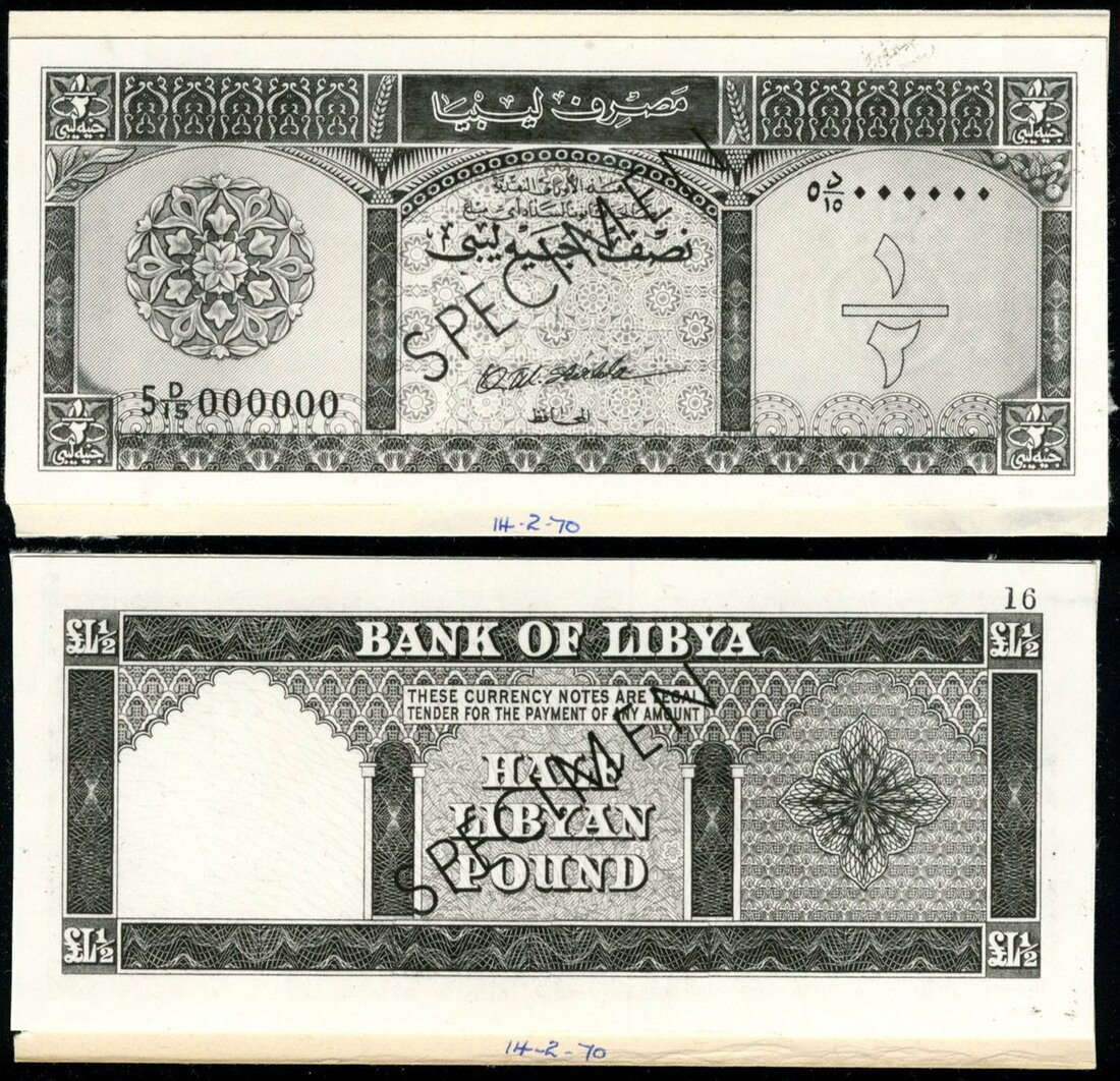 Bank of Libya, a pair of obverse and reverse printer's archival photographs for an unadopted design of 1/2 pound, 1970, decorative designs and boarders,