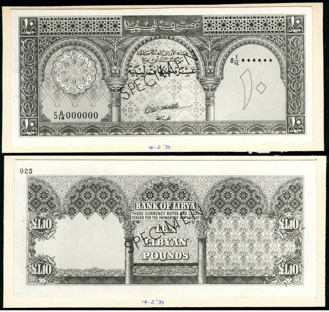 Bank of Libya, a pair of obverse and reverse printer's archival photographs for an unadopted design of 10 pound, 1970, decorative designs and boarders,