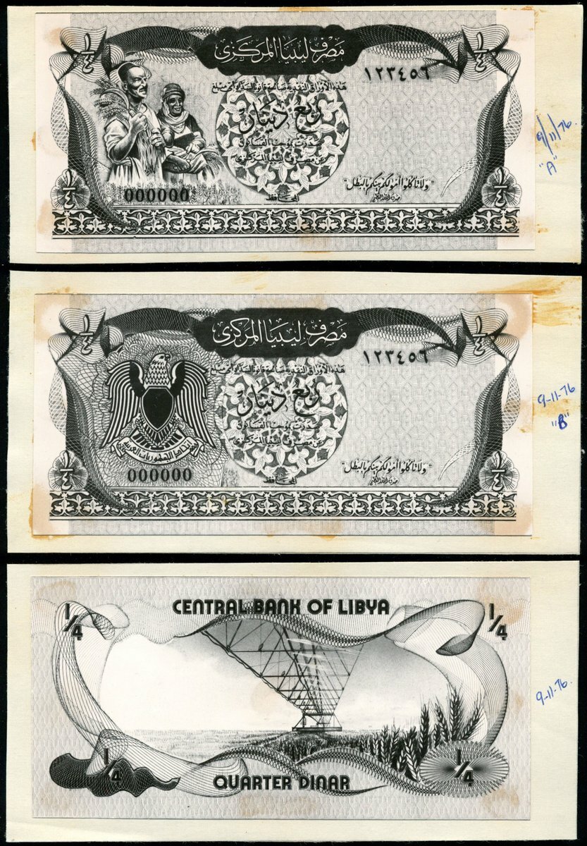 Central Bank of Libya, a set of obverse and reverse printer's archival photographs for unadopted designs of 1/4 dinar, 1976, 'A' design with two farmers at left, 'B' design with arms at left, similar boarder and underprints to the 1980 issue, reverse, irrigation system above wheat field, reverse design used on the 1980 issue 1/2 dinar instead,