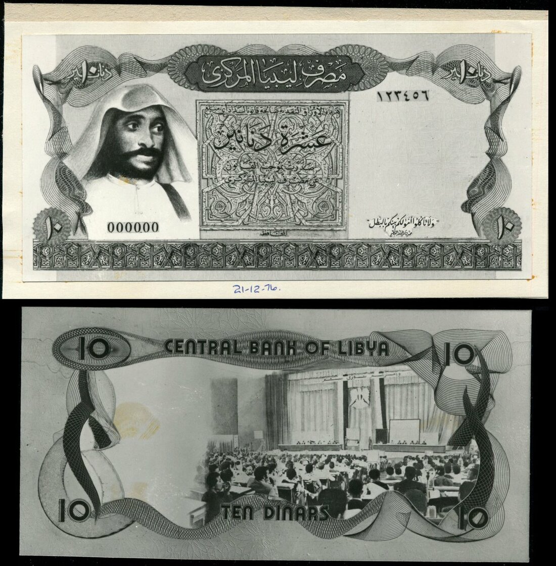Central Bank of Libya, a pair of obverse and reverse printer's archival photographs for an unadopted design of 10 dinars, 1976, black and white, man at left, government meeting at reverse,