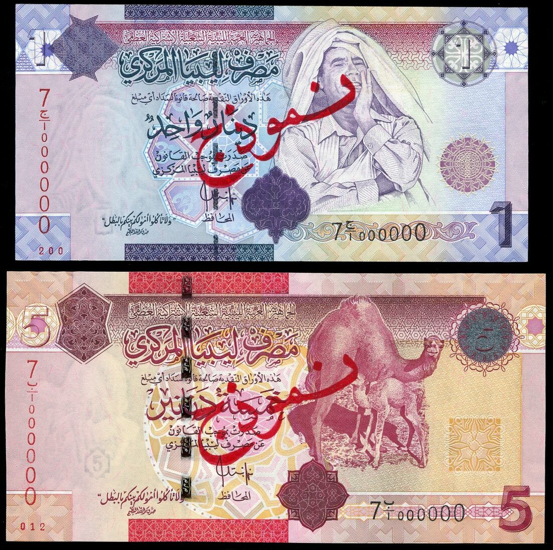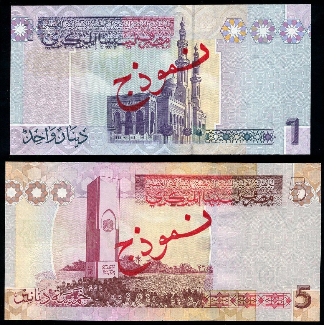 Central Bank of Libya, specimen 5, 1 dinar, ND (2009), (Pick 72s, 71s, TBB B536s, B535s), 1 dinar minor handing at lower margin, about uncirculated, 5 dinar uncirculated, beautiful contrast of colours, scarce