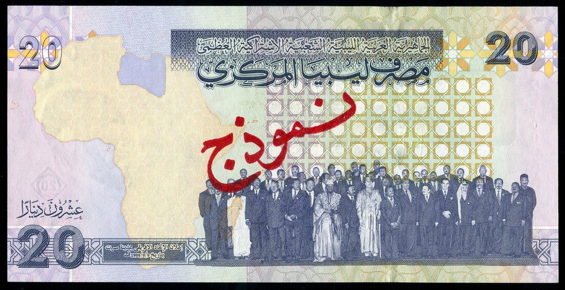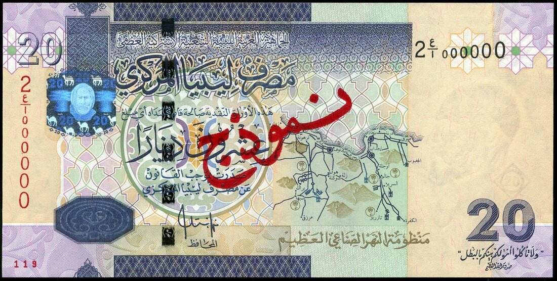 Central Bank of Libya, specimen 20 dinars, ND 2009, (Pick 74s, TBB B538s), red Arabic SPECIMEN at obverse and reverse, uncirculated, scarce