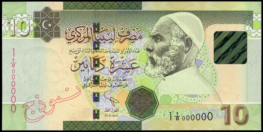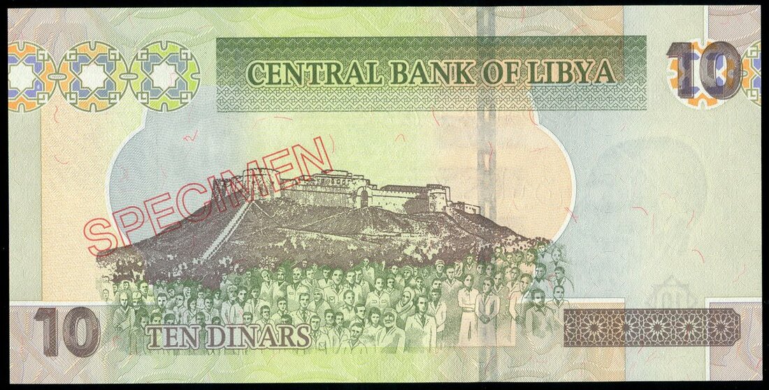 Central Bank of Libya, specimen 10 dinars 2008 issue, (Pick 78s, TBB B542s), red hollow Arabic SPECIMEN with red hollow Latin SPECIMEN overprint, uncirculated, scarce variety of Specimen