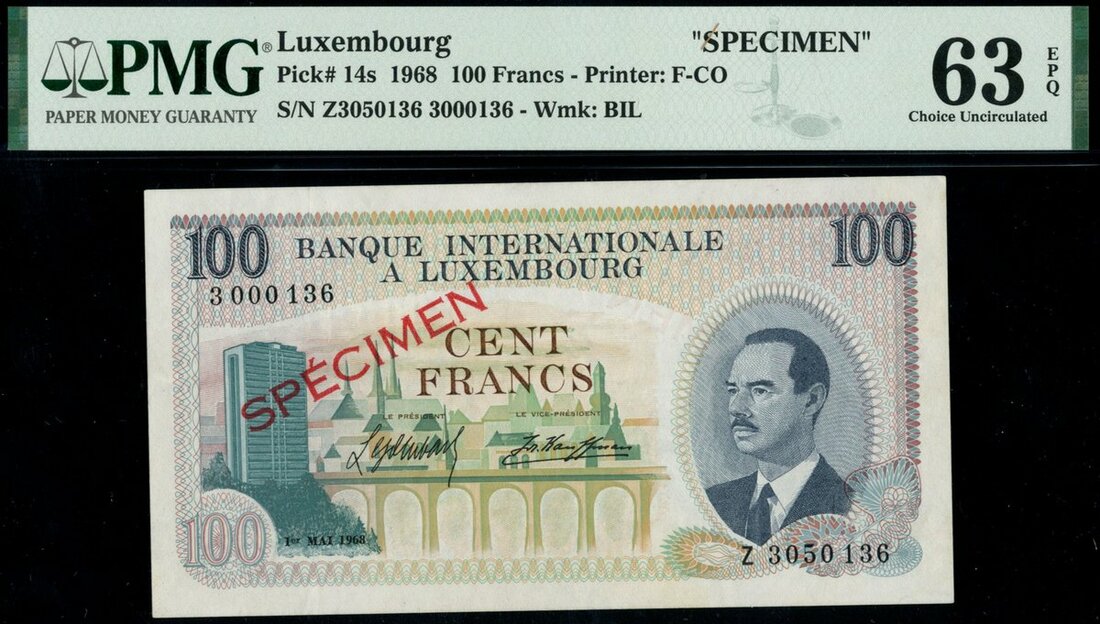 Banque Internationale a Luxembourg, , specimen 100 francs, 1968, serial number 3000136/Z 3050136, blue and multicoloured, Grand Duke Jean at right, the city of Luxembourg at centre