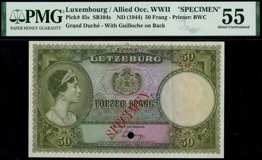 Grand Duche de Luxembourg, specimen 50 francs, Letzeburg, ND (1944), without serial numbers, green and pink, Grand Duchess Charlotte at left, arms at centre