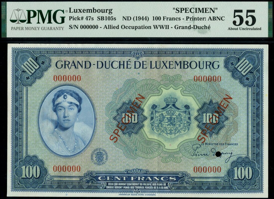 Grand Duche de Luxembourg, specimen 100 francs, ND (1944), red serial number 000000, blue and multicoloured