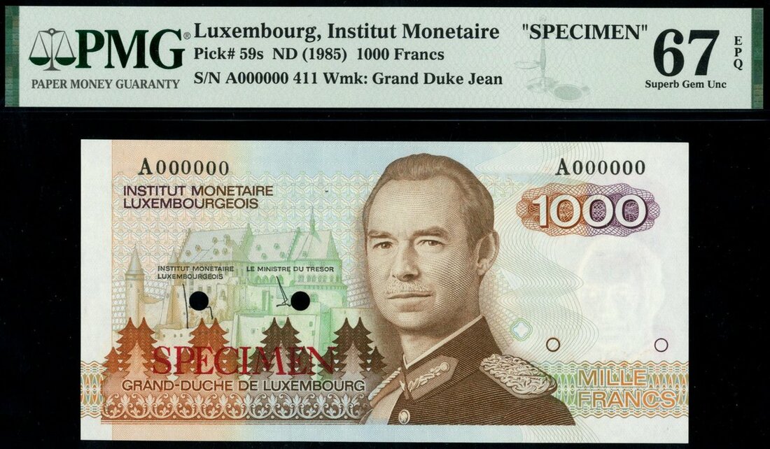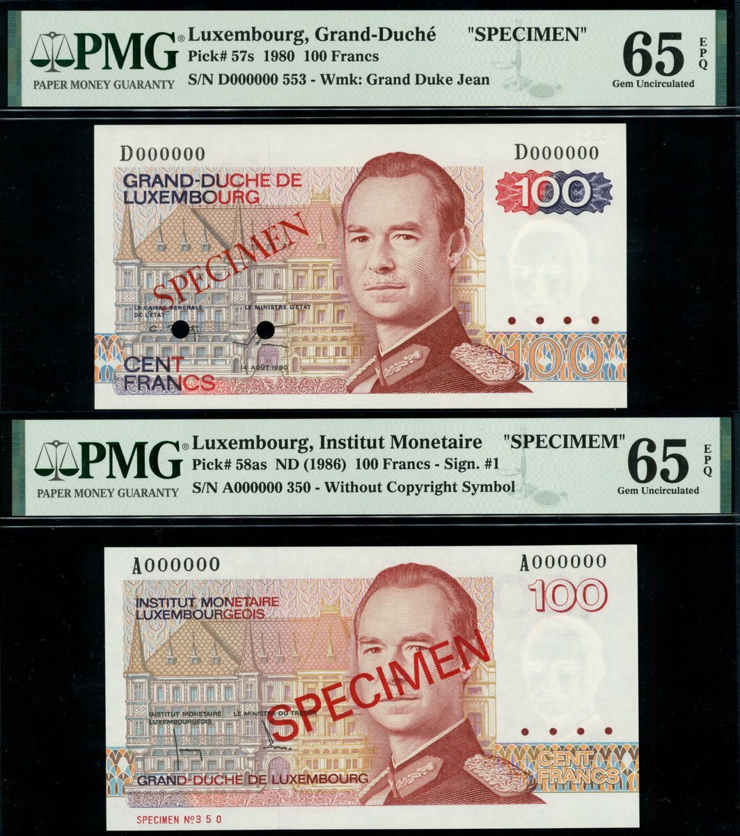 Grand Duche de Luxembourg, specimen 100 francs, 1980, serial number D 000000, red and multicoloured, Grand Duke Jean at right, also Institut Monetaire Luxembourgeois sprcimen 100 francs, ND (1986), serial number A 000000, red and specimen 1000 francs, ND (1985), serial number A 000000, brown, both Grand Duke Jean at right