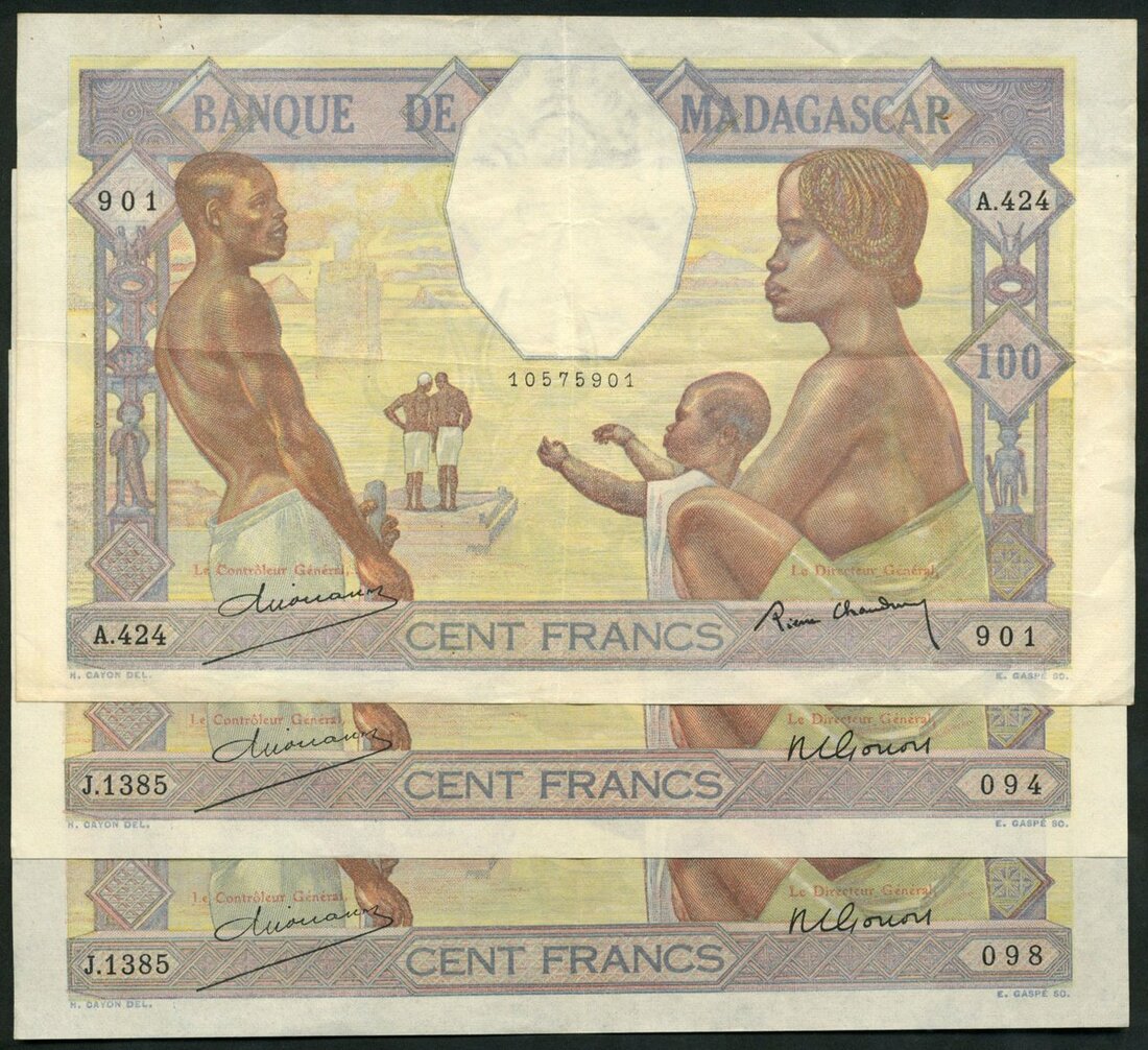 Banque de Madagascar, 100 francs (3), ND (1937), prefix A.424, J.1385, (Pick 40b, TBB 206b), all with pinholes, first note very fine, remaining two extremely fine (3 notes)