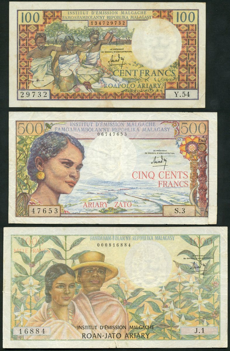 Institut d’Émission Malgache, Malagasy, 100, 500 and 1000 francs, ND (1964-66), (Pick 57, 58, 59), very fine (3 notes)