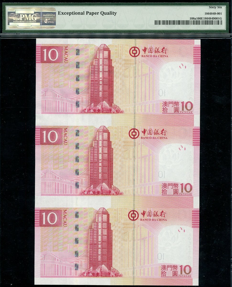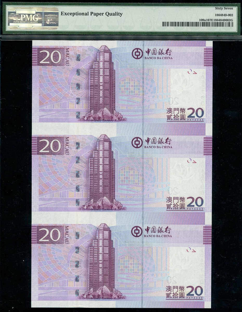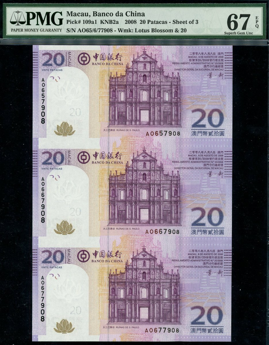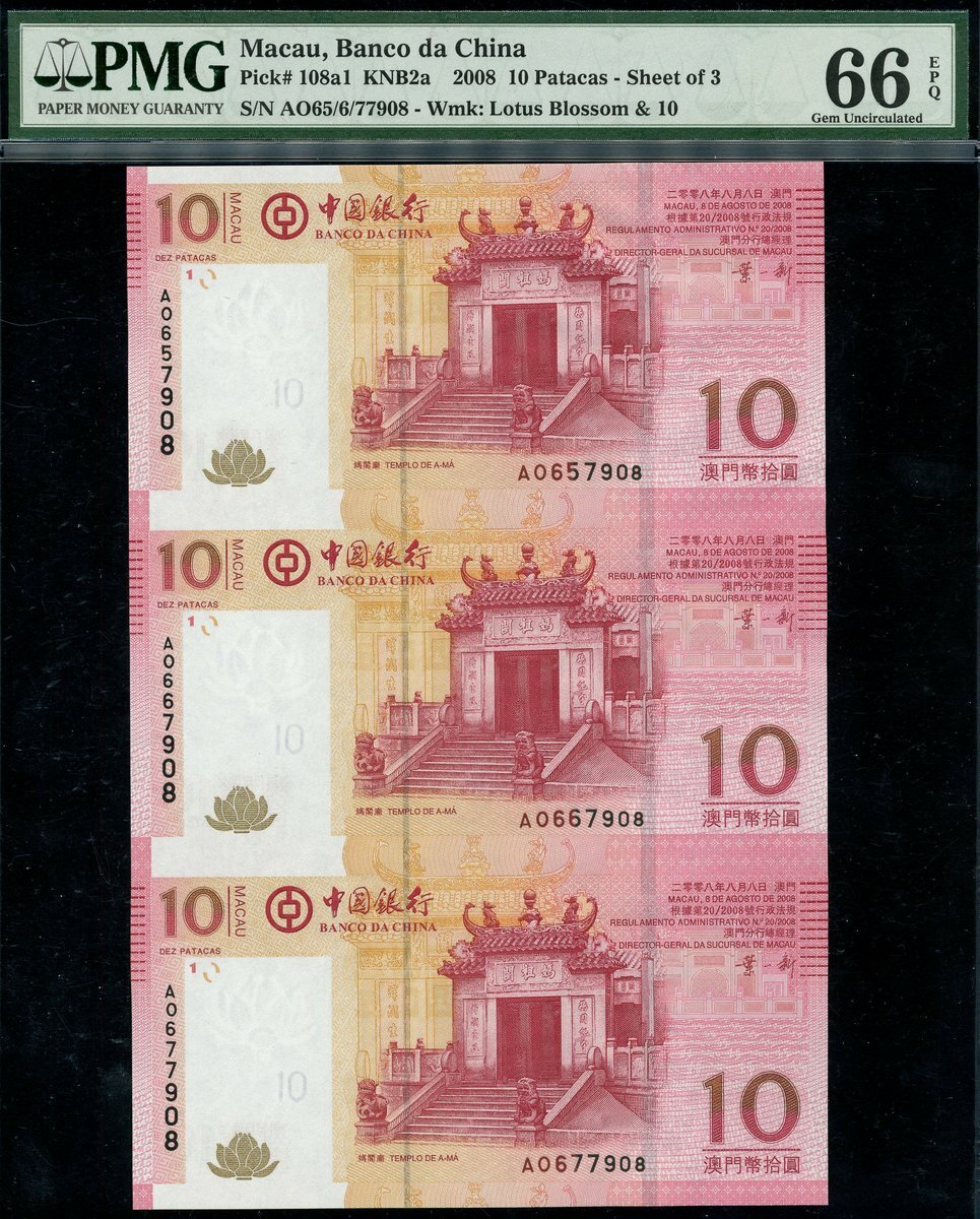 (x) Banco de China, Macau, two sheets of three 10 and 20 Patacas, 2008, matching serial number A0657908/0667908/0677908, also Bank of China, 100 yuan, Chungking, 1940,