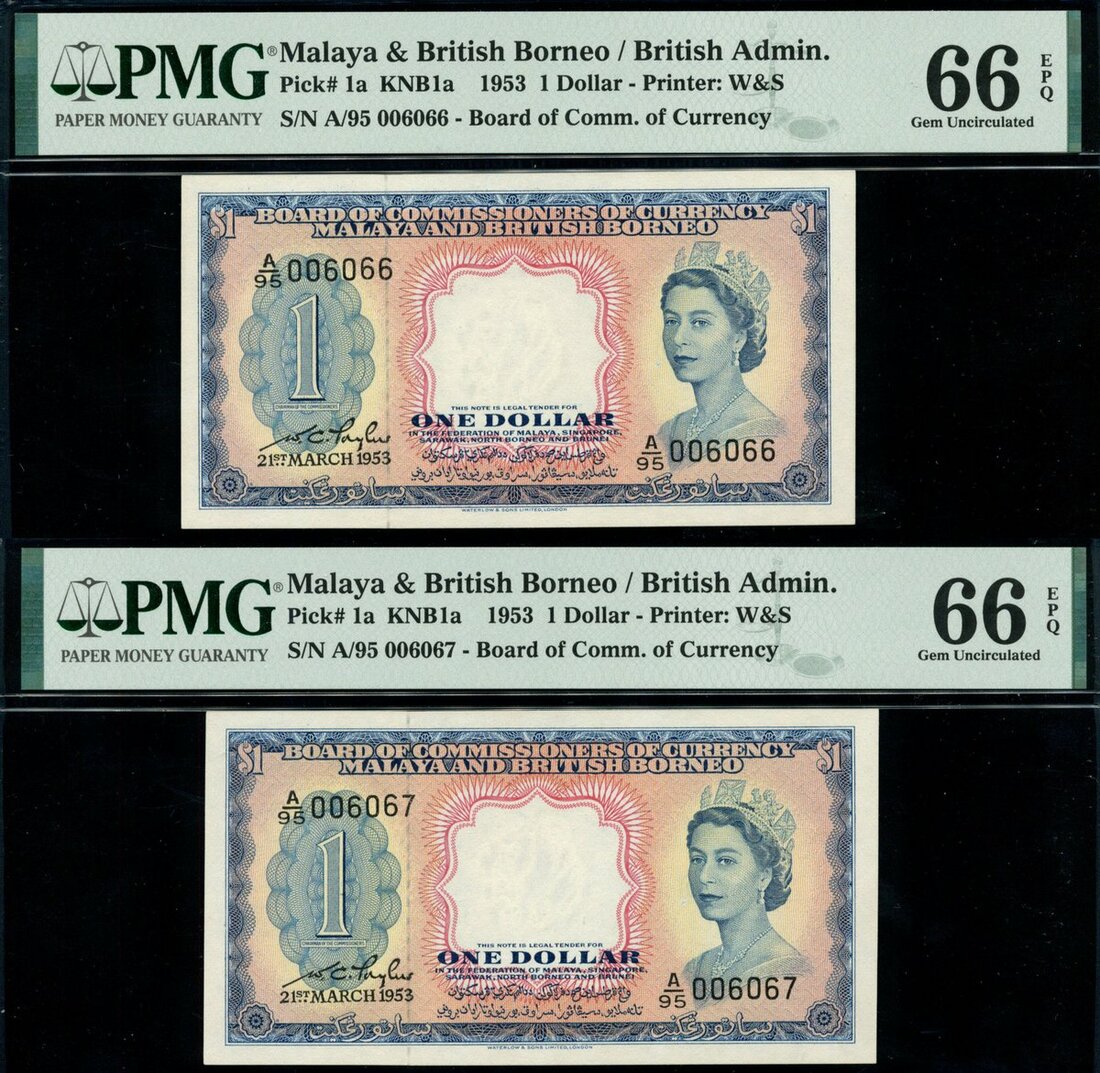 Board of Commissioners of Currency, Malaya and British Borneo, $1 (2), 21 March 1953, serial number A/95 006066/6067, blue on red and yellow underprint, Elizabeth II at right, value at left, Taylor signature, reverse blue, 16 coats of arms