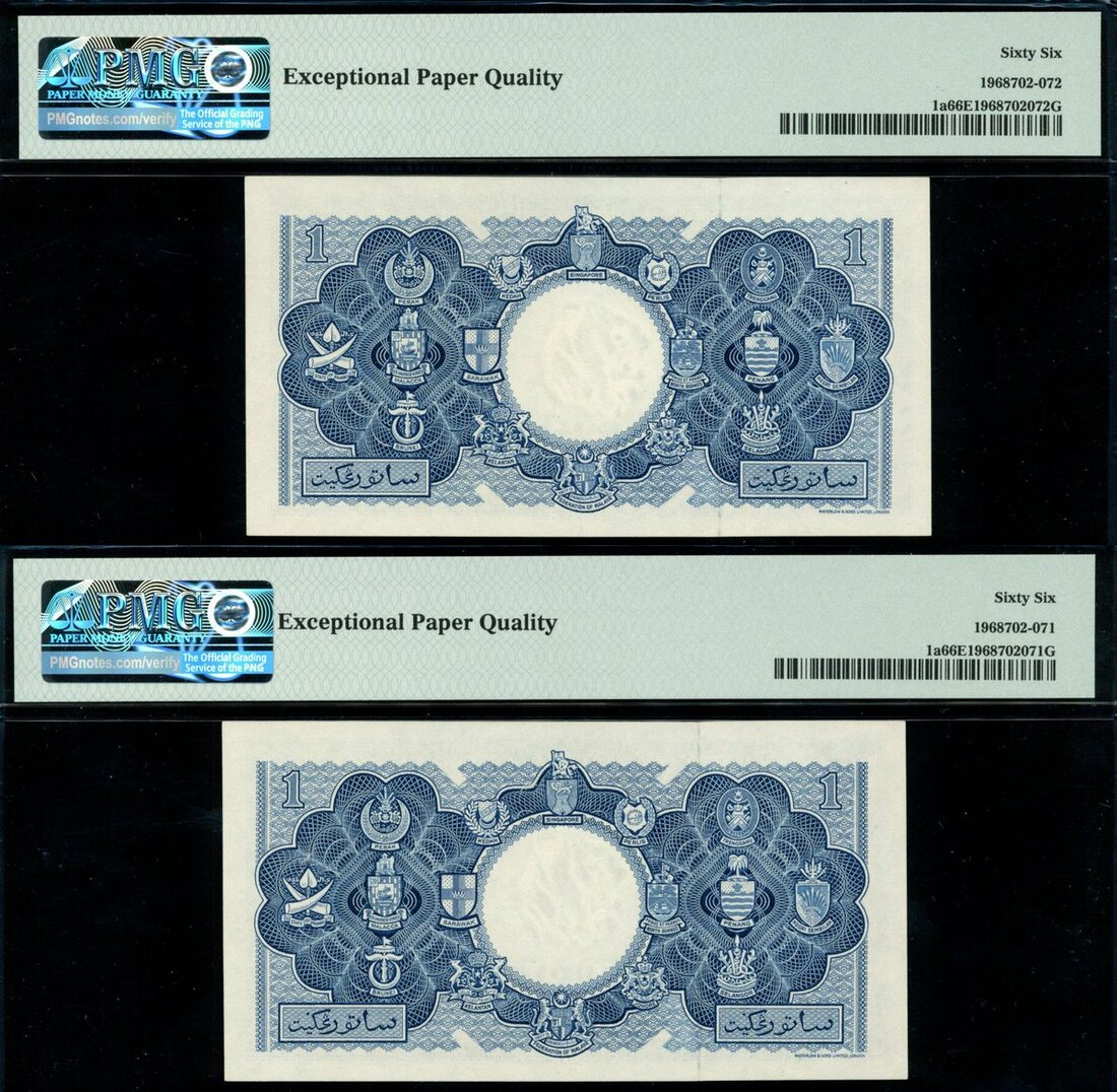 (Pick 1a, TBB B101a), in PMG holders, both 66 EPQ Gem Uncirculated, a scarce consecutive pair (2 notes)