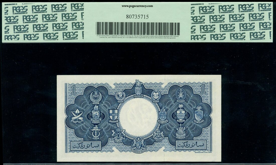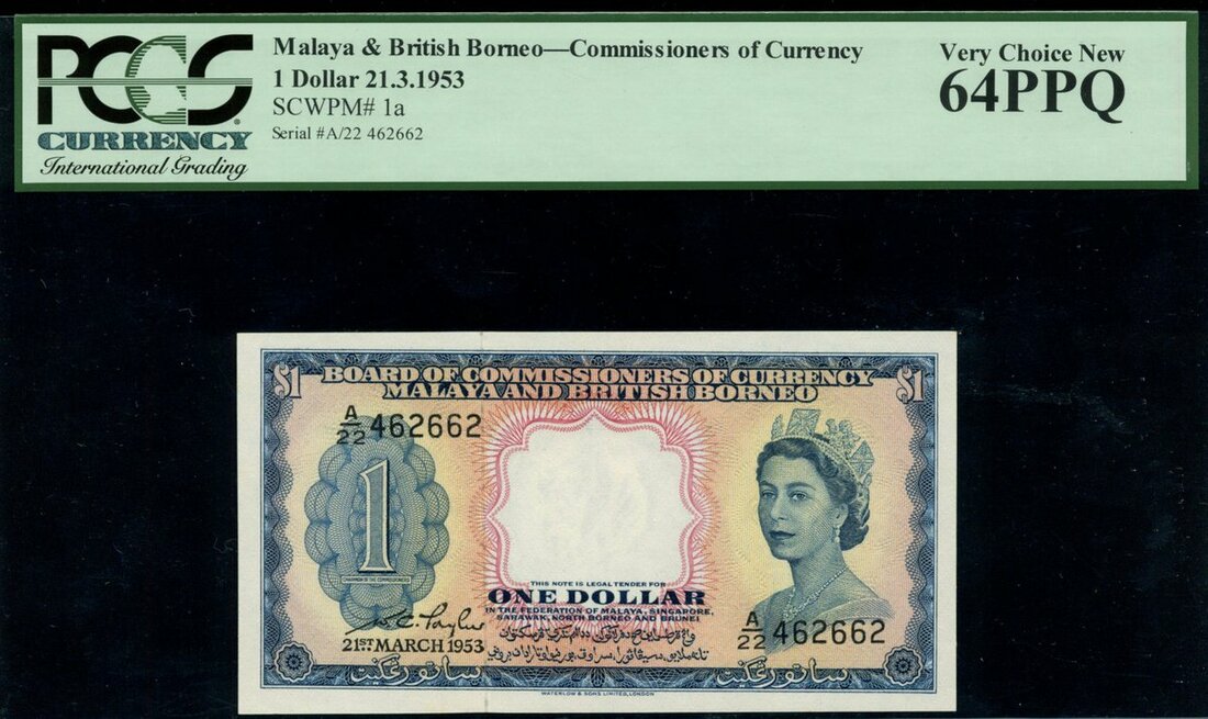 Malaya & British Borneo, Board of Commissioners of Currency $1, 21st March 1953, serial number A/22 462662, blue, orange and pink, Queen Elizabeth II at right, reverse 16 coats of arms,