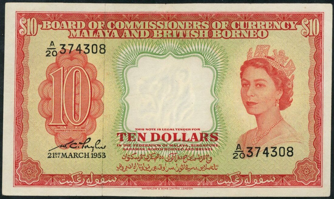 Board of Commissioners of Currency, Malaya and British Borneo, $10, 21 March 1953, serial number A/20 374308, red and green and white, Elizabeth II at right, signature of Taylor, reverse red and white, arms