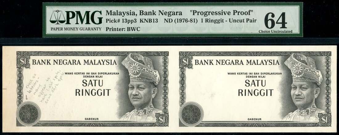 (x) Bank Negara Malaysia, an uncut pair of obverse progressive die proofs on card for a 1 ringgit, ND (ca 1976), black and white, Tuanku Abdul Rahman at right, reverse blue and white, arms and value