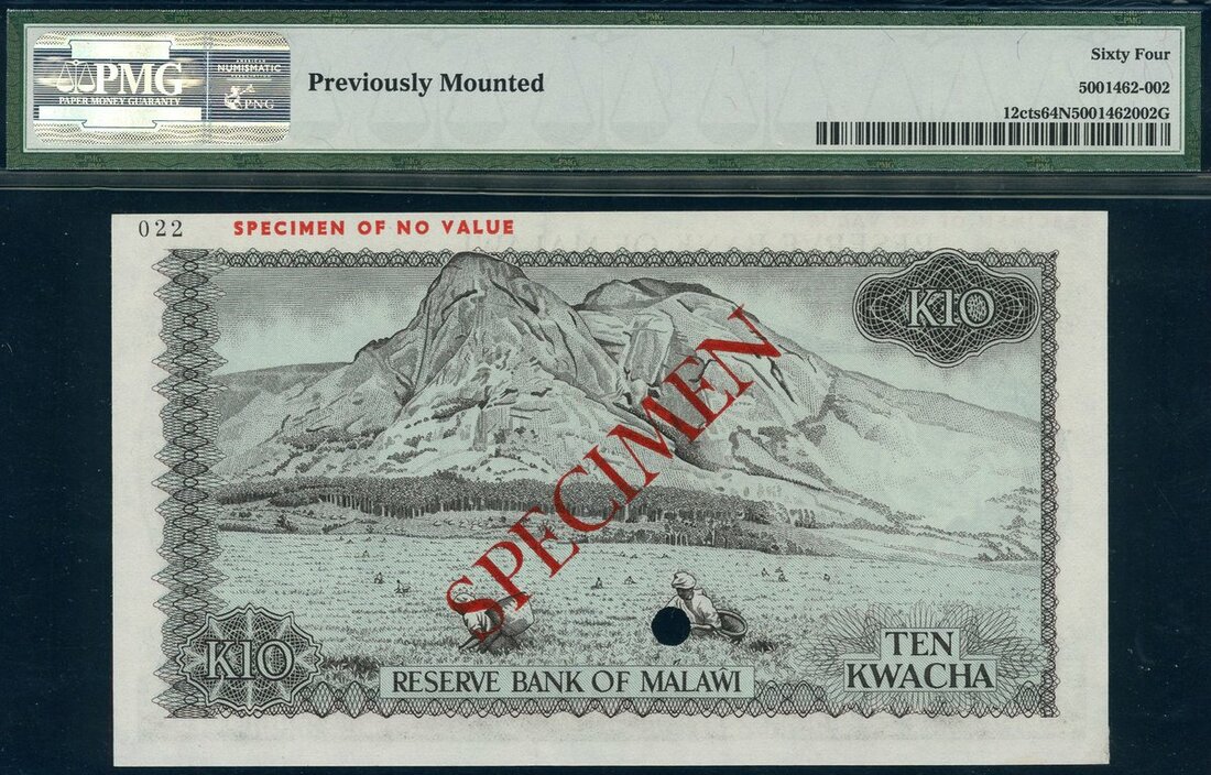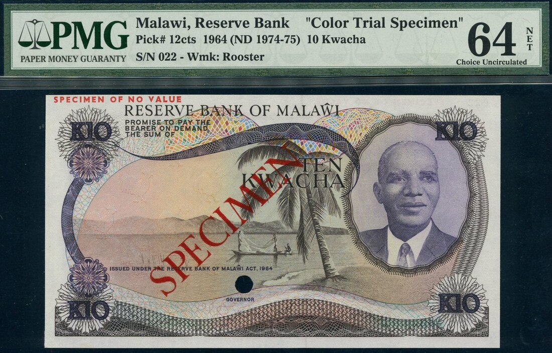 (x) Reserve Bank of Malawi, colour trial specimen 10 kwacha, ND (1974-75), (Pick 12cts, TBB B112cts), in PMG holder, previously mounted, 64 NET Choice Uncirculated