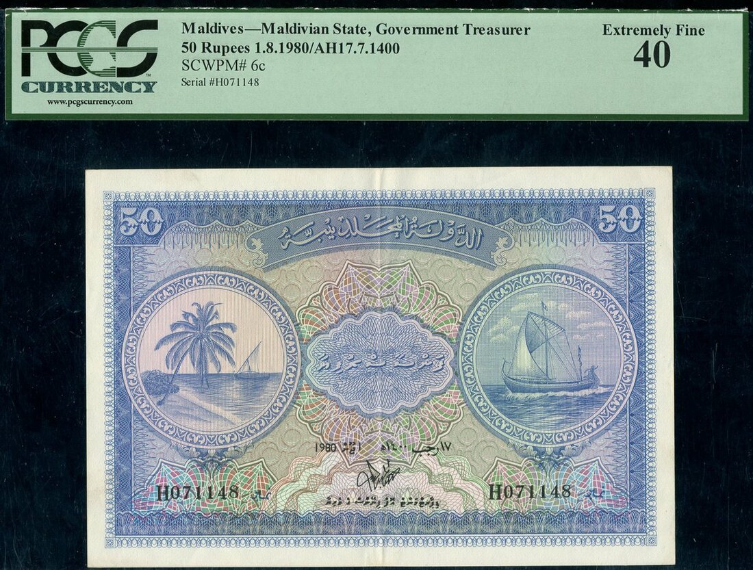 (x) Government of the Maldives, 50 rufiyaa, 1980 (AH1400), serial number H071148, (Pick 6c, TBB B106c), in PCGS Currency holder 40 Extremely Fine