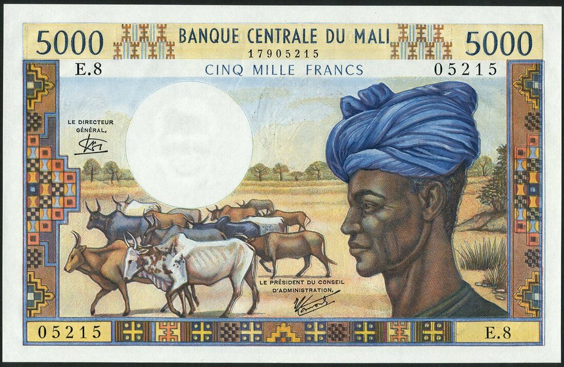 (x) Banque Centrale du Mali, 5000 francs, ND (1971), serial number B.8-87501, blue and multicoloured, man wearing blue turban at right, Zebu at left, signatures of Miege and Kanoute, reverse multicoloured, girl at left cultivating cotton, girl at right with 'tissage moderne'