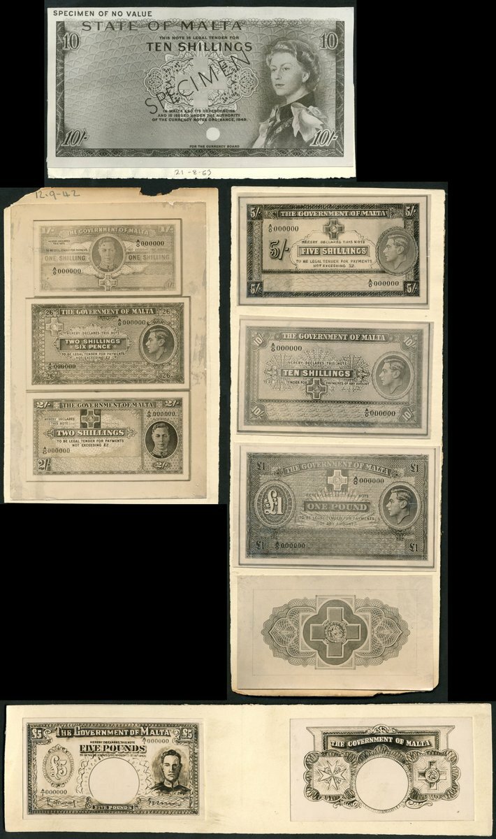 Government of Malta, printers archival photographs for proposed issues of 5/-, 10/- and £1, 1938/1942, obverse and reverse 5/-, 1938, 1/-, 2/6 and 2/-, 1942 and an obverse and reverse £5 of the same era