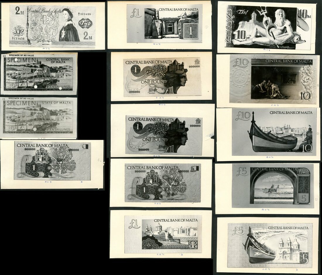 State Bank of Malta, a group of printers archival photograph of a proposed reverse for a 10/-, ca 1963, Government of Malta, also photographs for Central Bank proposed issues of a reverse of a 10/-, proposed issue for £1, four obverses and two reverses, reverses of £5 (2) and £10 (3), in addition two proposed issues for a 2 Maltese pound . This group with annotated date 1971